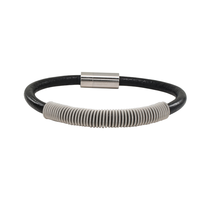 You'll be strummin' in style with this handcrafted leather bracelet. Electric guitar strings coiled around thick leather - the perfect combination of rock 'n' roll swagger and smooth style!